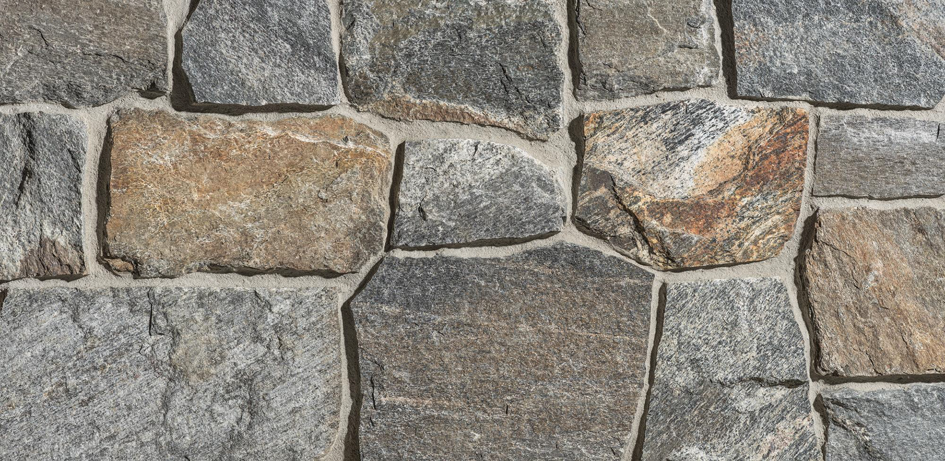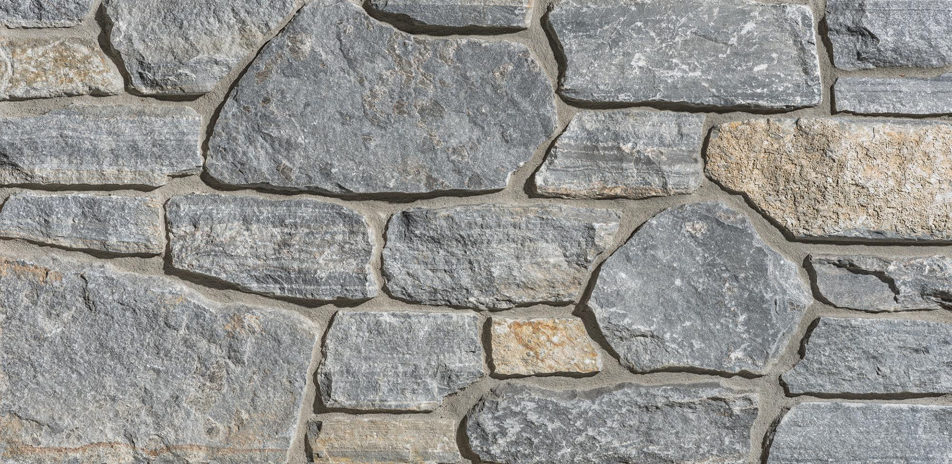 Homestead Rubble is a unique blend of several styles of stone, including mosaics, ashlars, and ledgestones. It is intended to replicate the appearance of natural stone used on early era buildings.